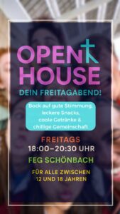 Jeden Freitag Abend (außer in den Ferien) treffen wir uns um 18:00 Uhr im Gemeindehaus der FeG Schönbach um zu chillen, eine gute Zeit miteinander zu verbringen & Spaß zu haben.